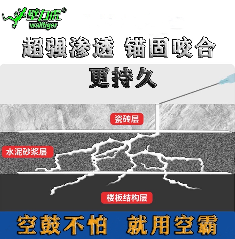 在装修中,瓷砖作为必不可少的装修硬件产品,然而,由于选择材料的不规范,搭配不合理或施工不标准,就会出现瓷砖与沙浆层之间的空鼓现象(行业术语:表空)或者沙浆层与主体结构的空鼓(行业术语:深空)。传统的修复方法要么是把瓷砖取掉,重新铺贴(还是有可能会空鼓),费用超级大不说,还影响工程进度。不仅费时费力费钱,还不一定能解决问题!然而有一些为了验收通过,搞水泥浆进去,那只是治标不治本,因为水泥浆在干燥的过程中水份蒸发,水泥收缩体积变小,而又出现空鼓。唯一能够快速,轻松又一次解决的办法就唯有注入AB型瓷砖空鼓胶产品,这个产品是反应固化,不会收缩,粘结力是瓷砖胶的5-8倍-壁力虎空霸瓷砖空鼓胶为瓷砖空鼓而生,为解决各种工地空鼓而精心研发,可以说是装修界的一大福音产品